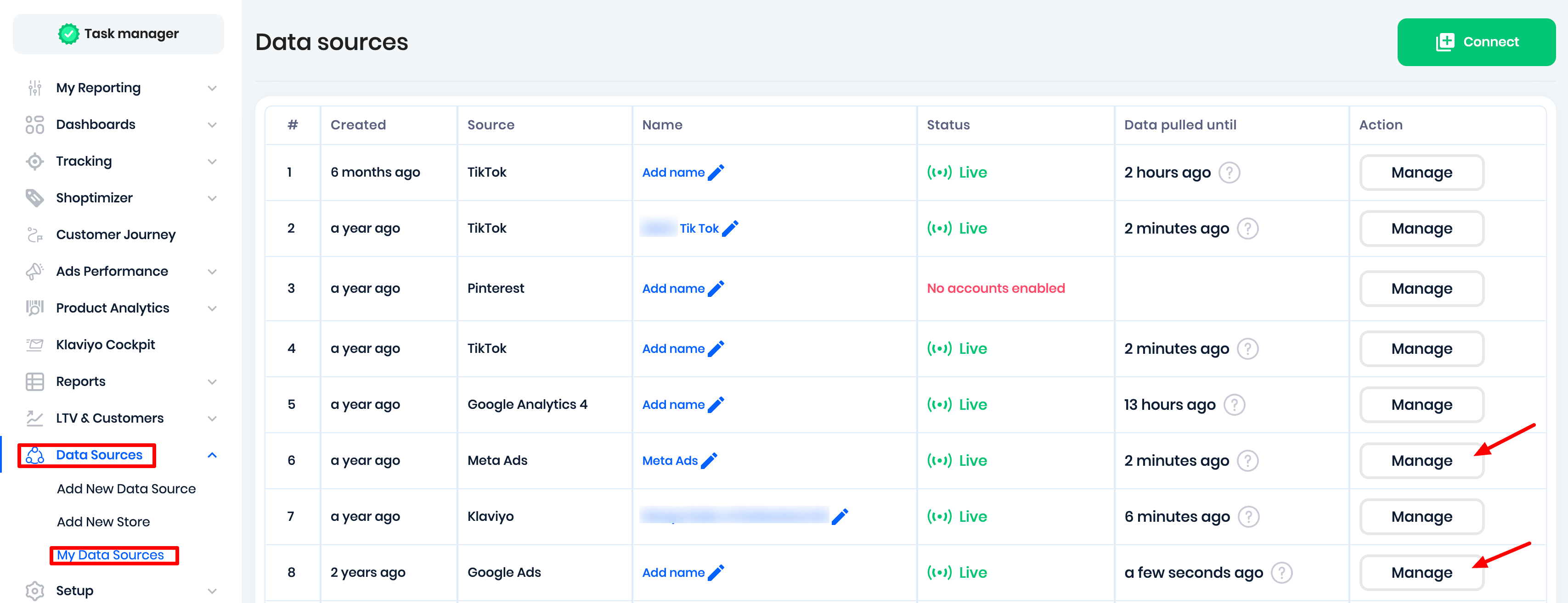 3. Click on the "Manage" button next to the marketing channel where you want to report on a second conversion event (ex., Lead signups)