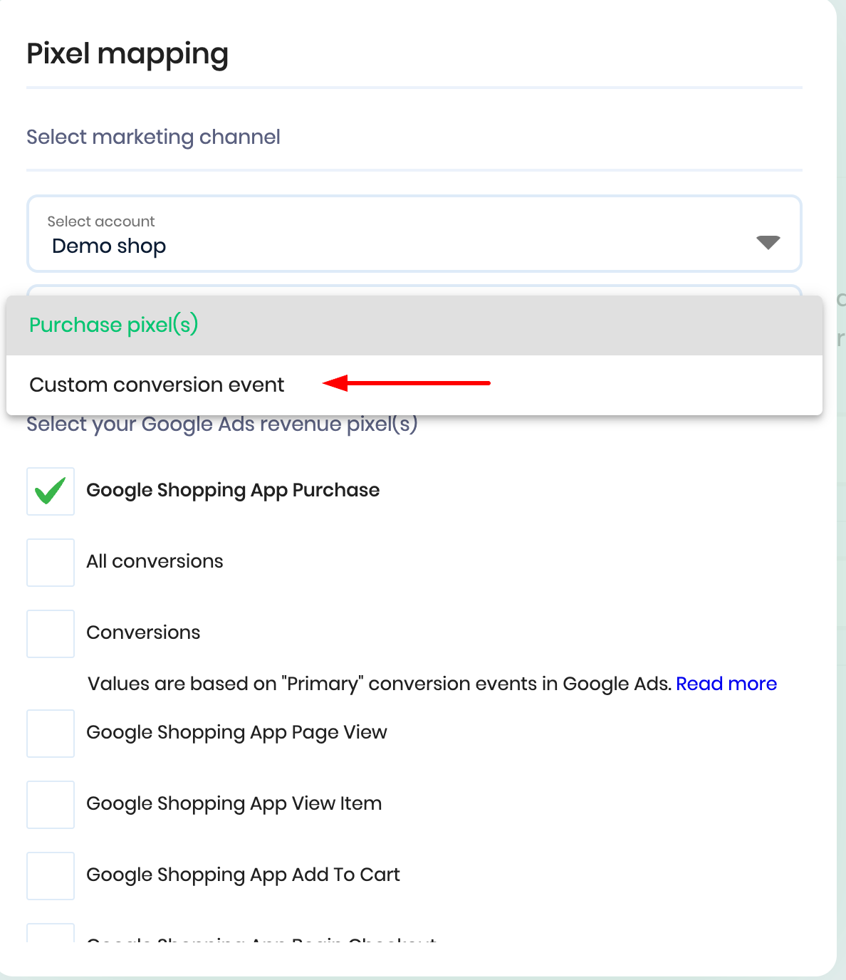 5. Click on the dropdown "Select conversion type" and select "Custom conversion event"
