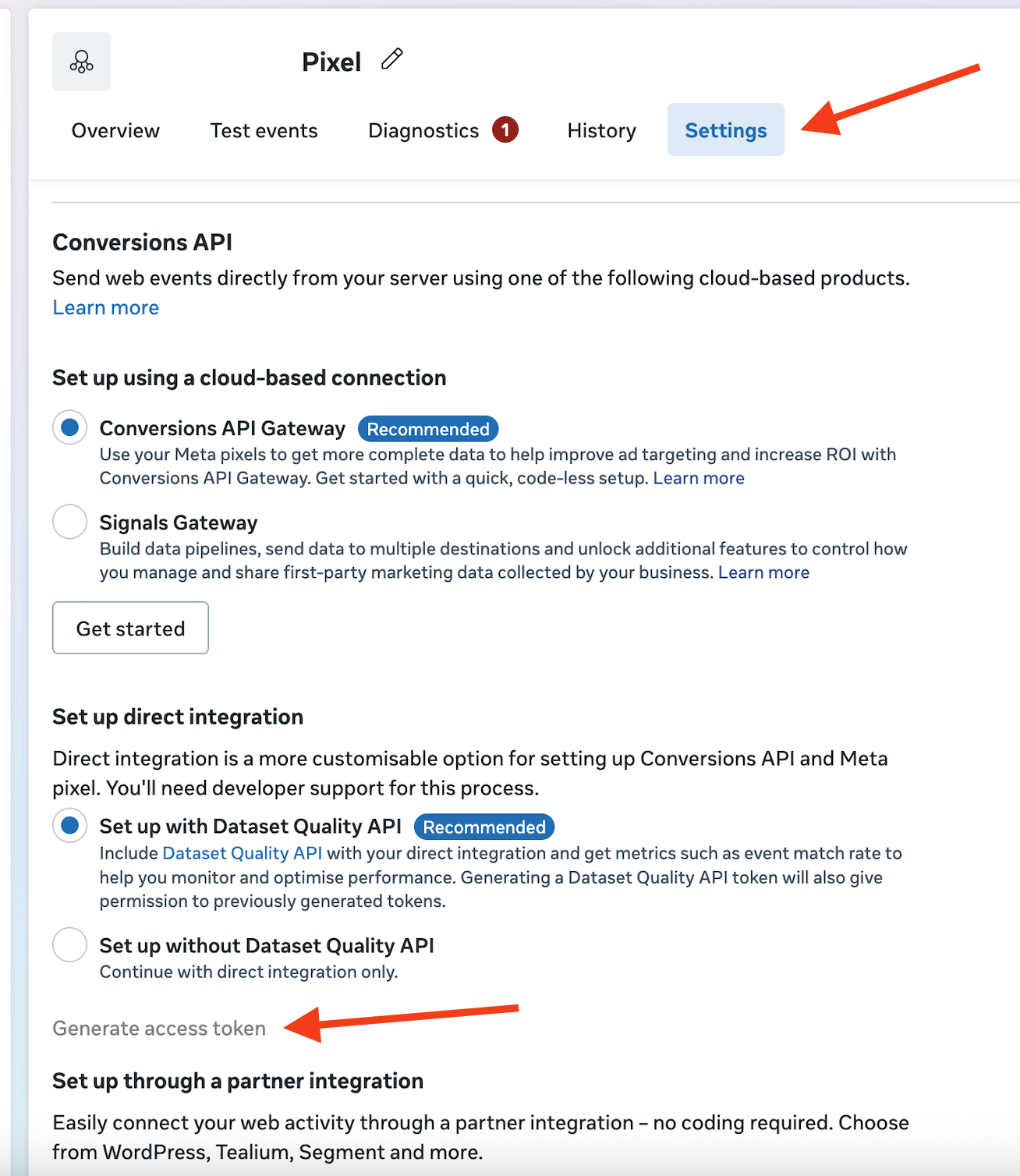 3. Go to data set Settings and scroll down to Conversions API section and Set up direct integration. Leave the default setting Set up with Dataset Quality API selected.
