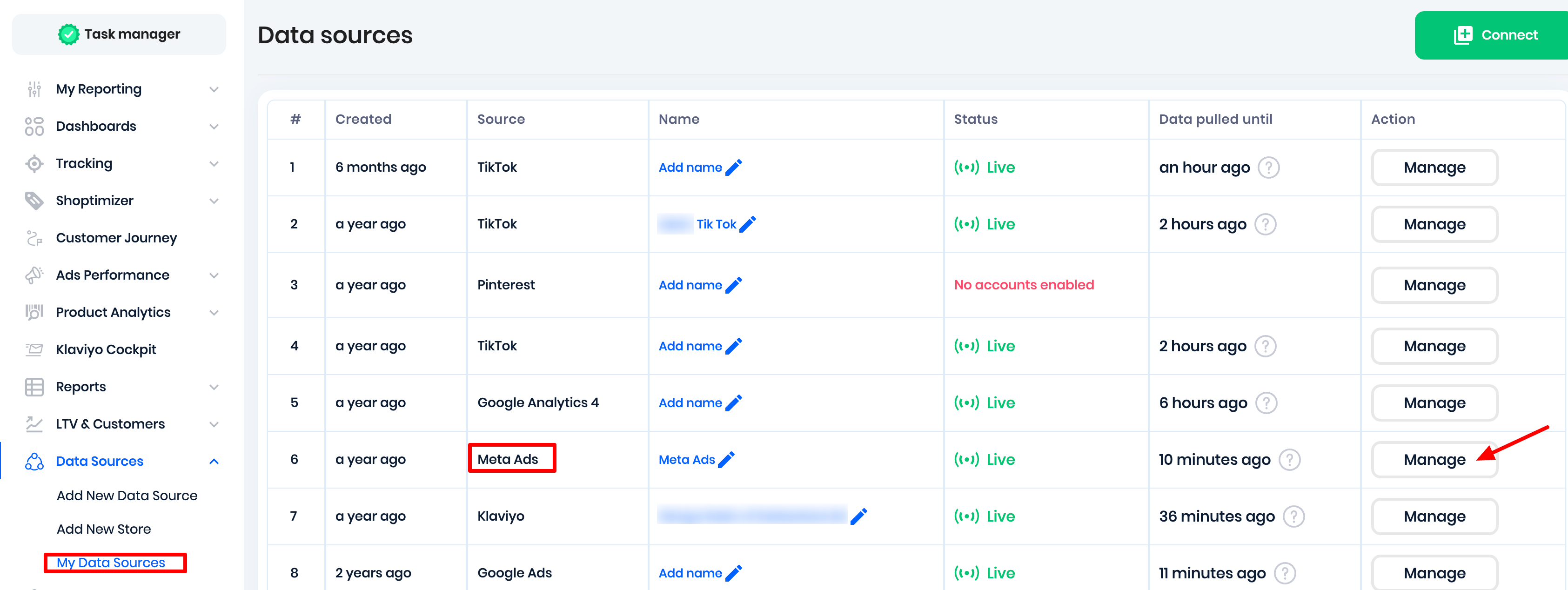 2. Click on "Manage" next to Meta Ads