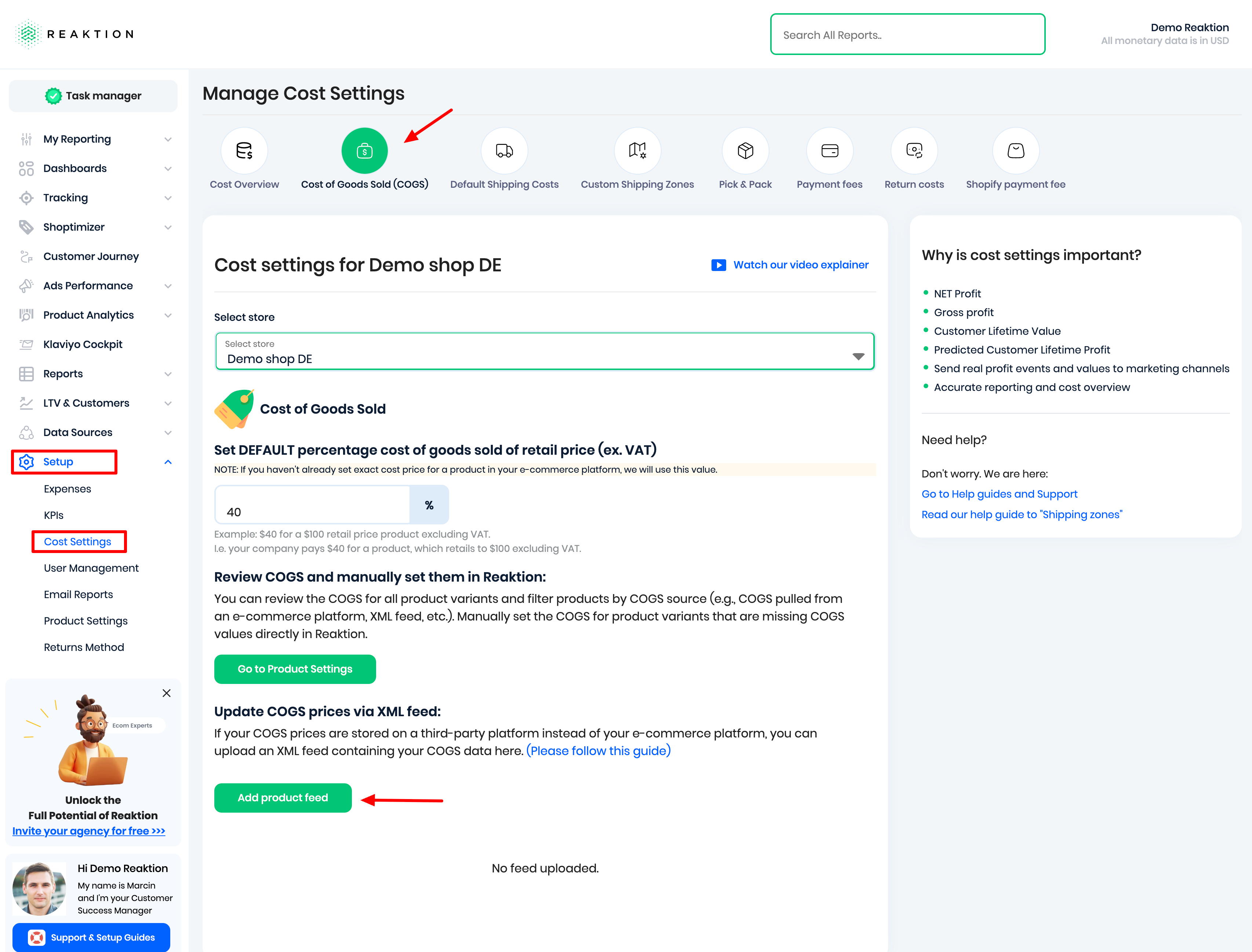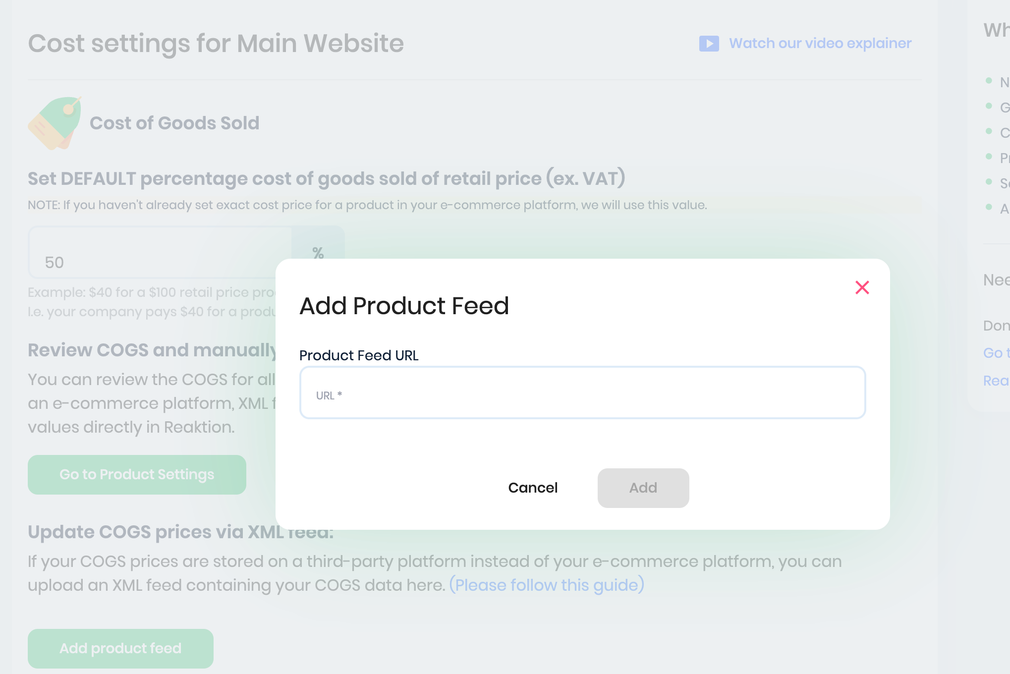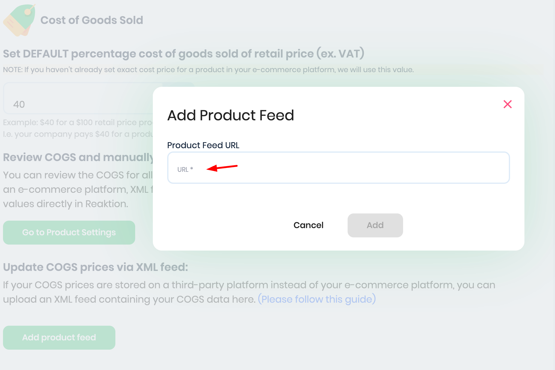 1. Log into Reaktion and navigate here: https://advertiser.reaktion.com/setup/cost-settings?step=1. Click on Setup > Cost Settings > Cost of Goods Sold (COGS) tab > 'Add product feed':