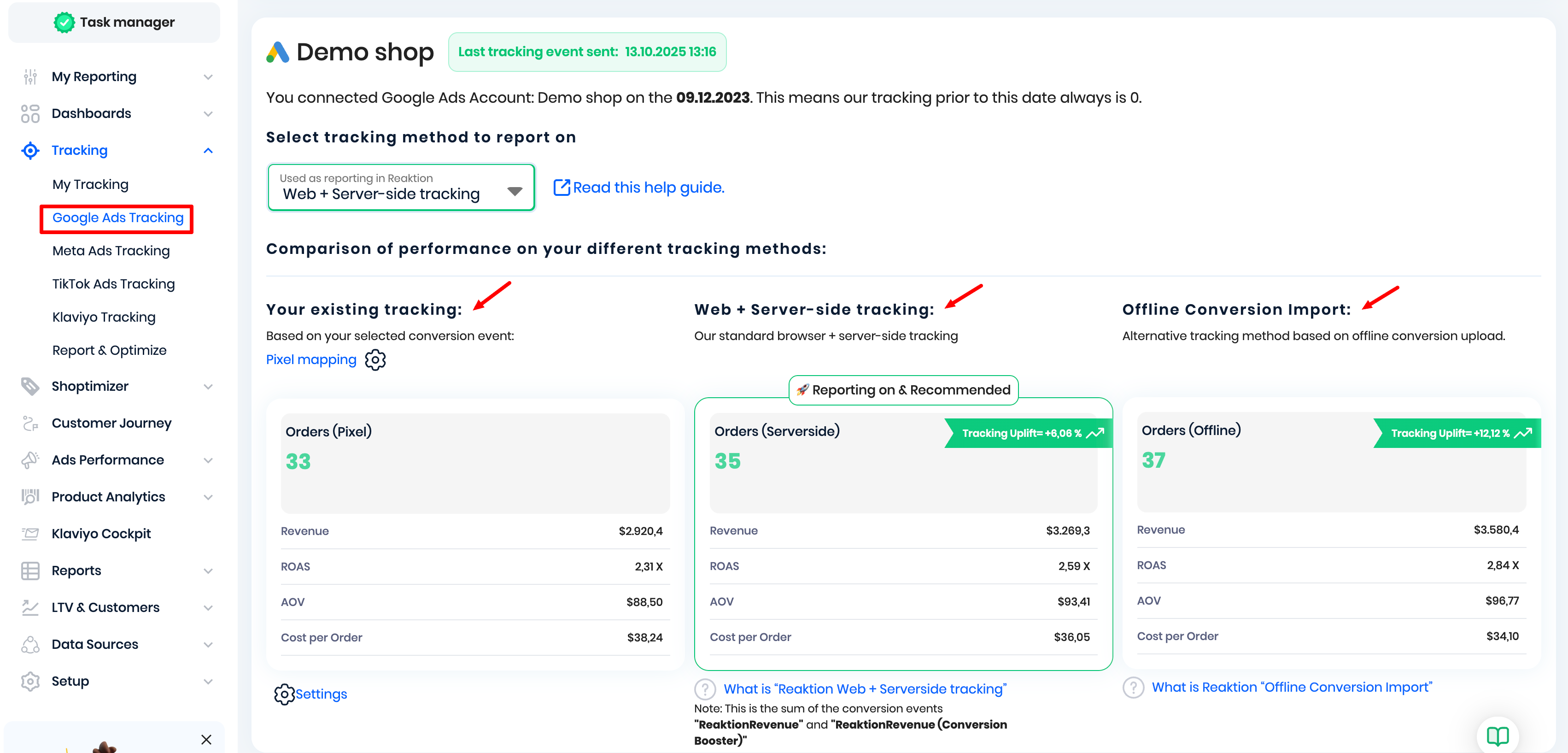 Reaktion tracking usually is more accurate, so just a few days after integrating Reaktion you should select ServerSide (ReaktionRevenue) for reporting for any period of time after installing Reaktion.