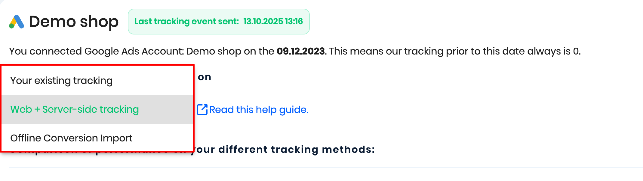 For each connected ad account, you will see a comparison of performance of 3 tracking methods: