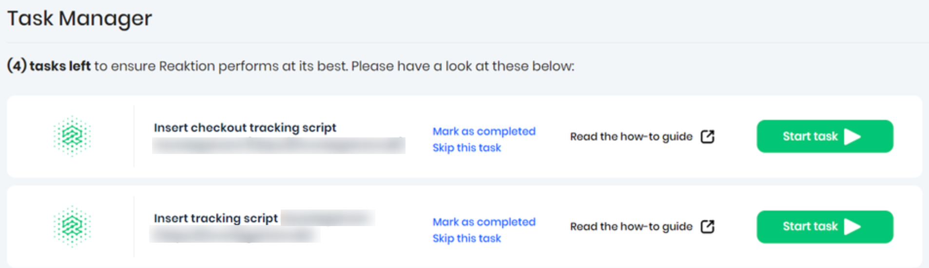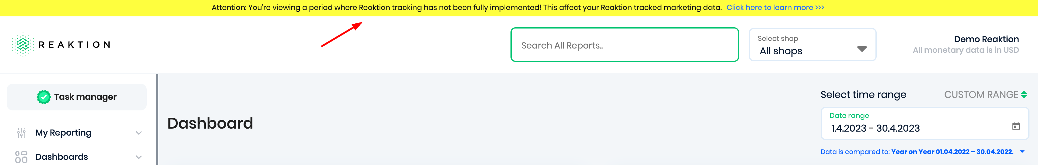 This is an essential task to ensure that Reaktion Tracking is working as expected. If you are missing a tracking script, you will see a banner in the top section of your screen notifying you which shop the tracking script is missing.