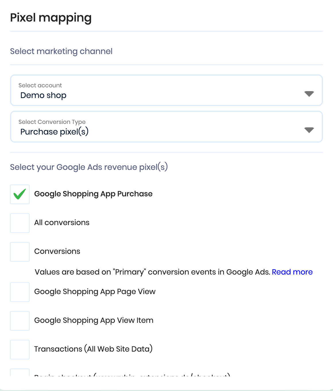 - Map the Pixel that equals a purchase. Only a pixel that equals to a sale/purchase must be selected; otherwise, other pixels selected would result in reporting inflated revenue and sales figures, potentially affecting the accuracy of our reports.