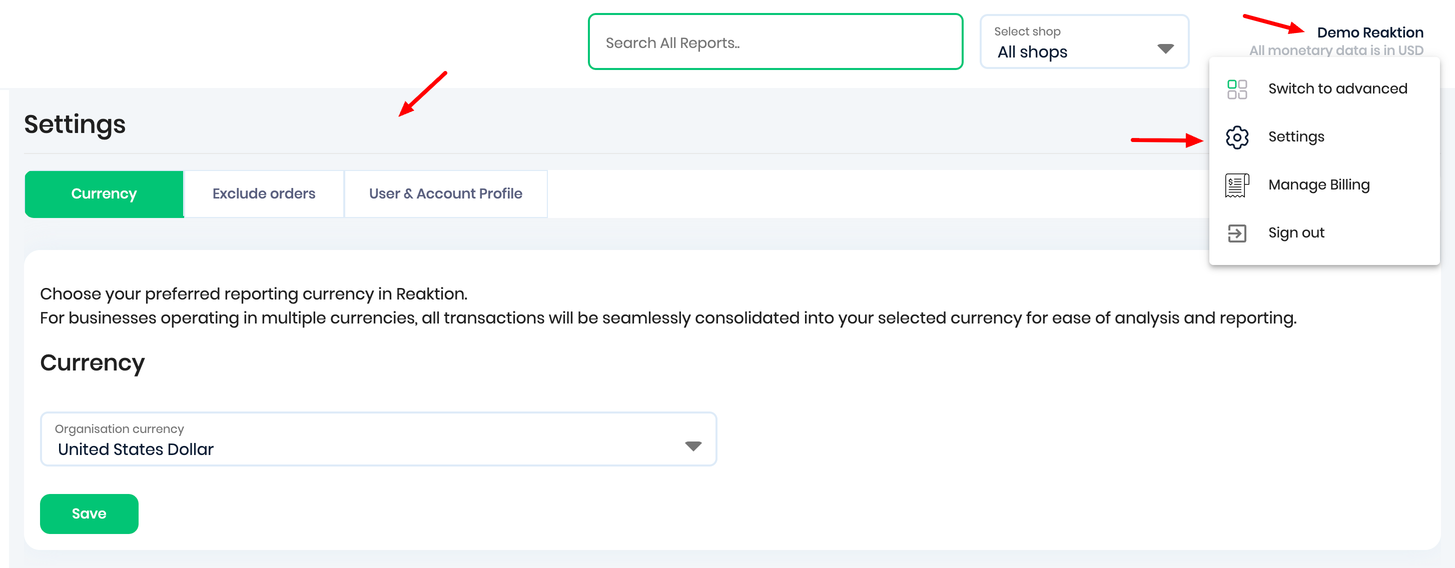 When you click on the user name in the top right, you can manage the settings of the Reaktion account you are currently viewing, like: