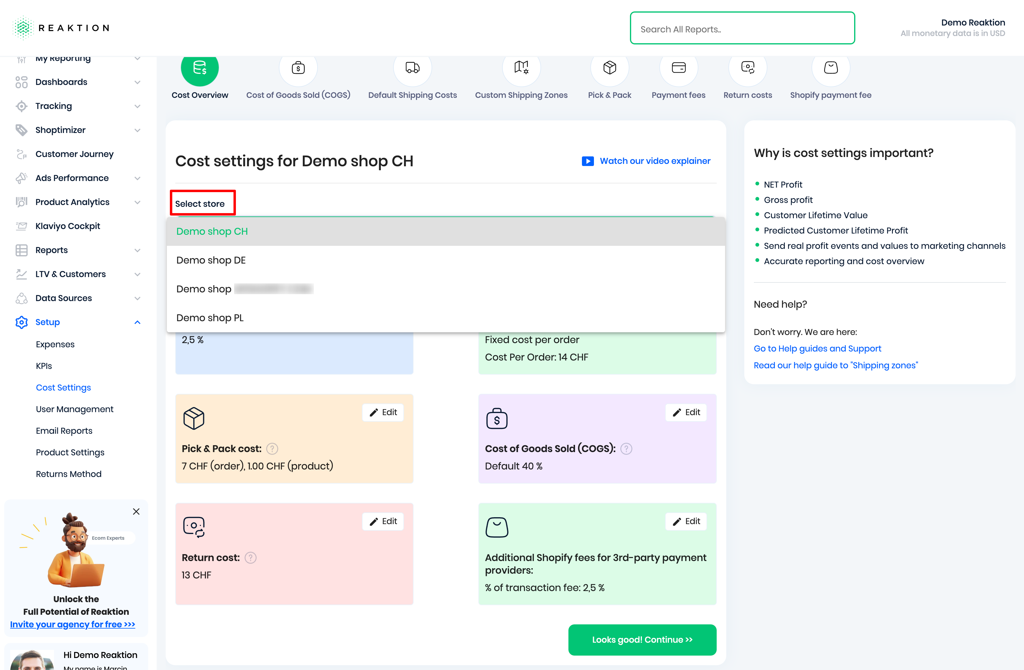 Please note you need to set up costs separately for each of your ecommerce stores - you might have different shipping rates in the US than in Sweden, etc