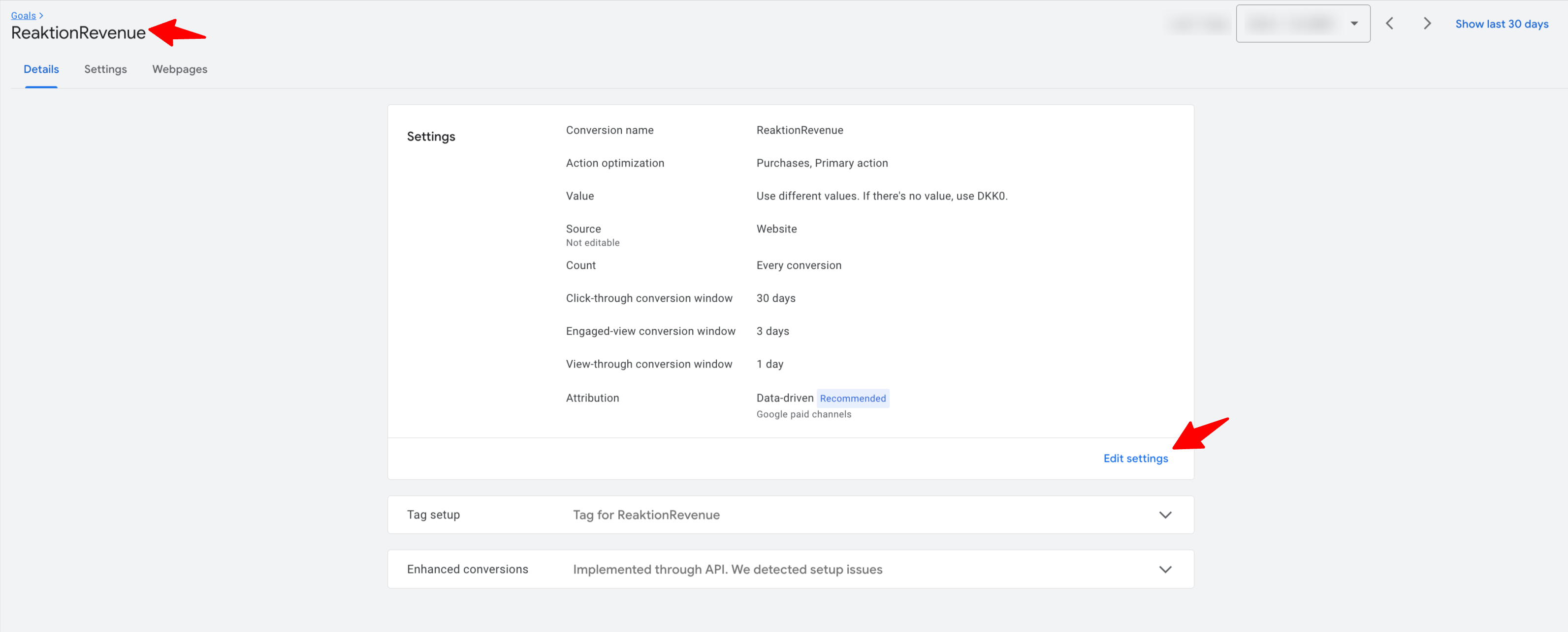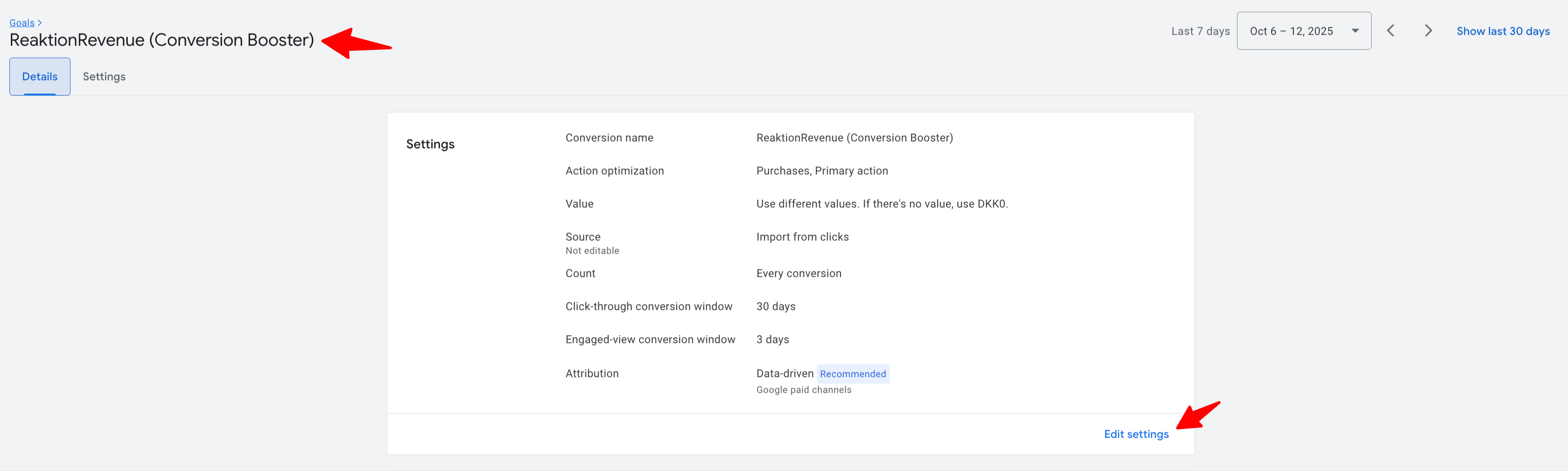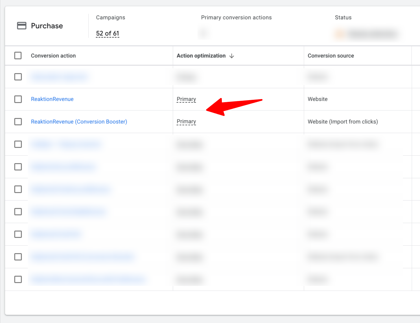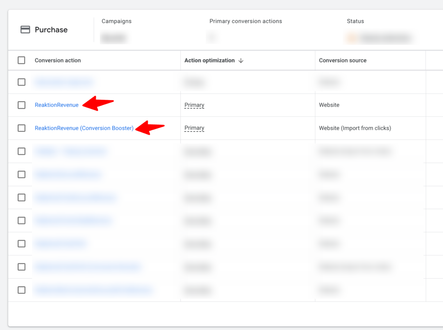 Start by finding the conversion action named "ReaktionRevenue" and ReaktionRevenue (Conversion Booster), then click on the name of the events.