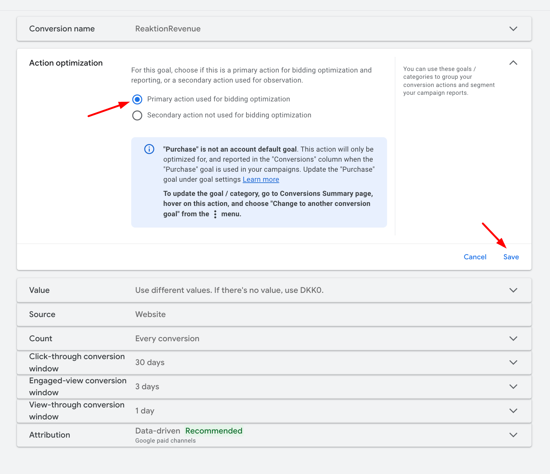 That's it! By setting these conversion actions as the primary events you are asking the Google Ads algorithm to optimize for revenue (order value) based on Reaktion server-side tracking!