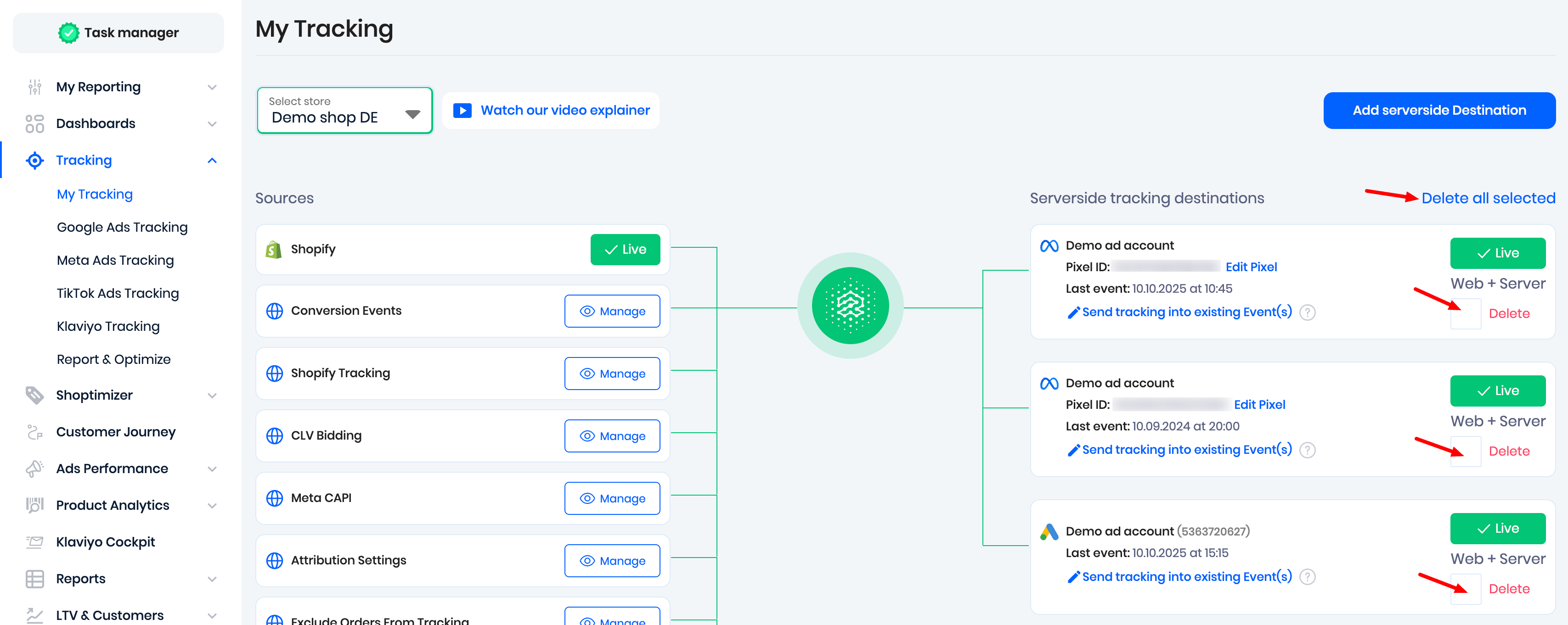 If under Serverside tracking destinations there are ad accounts that are not sending traffic to that store, please select those ad accounts and delete them. Make sure none of the stores are sending order data to an ad account that is dedicated to another store.