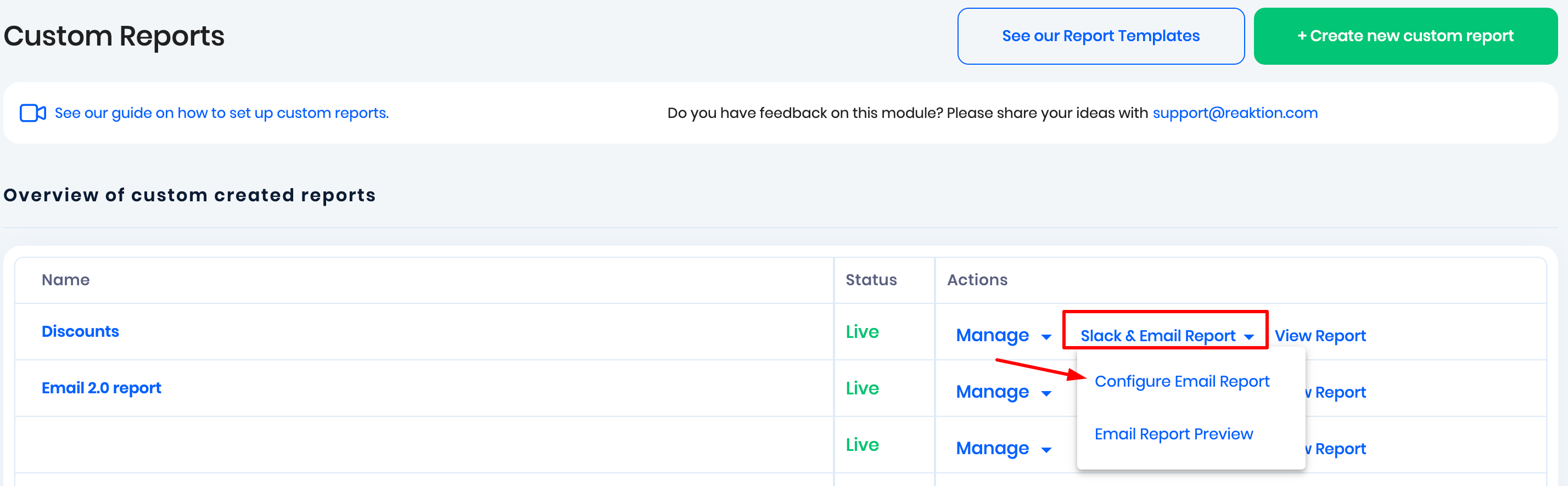 5. In the "Custom report" overview click on "Slack & email report" > 'Configure email report':