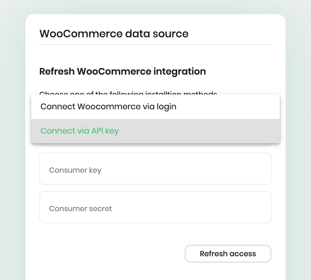 Next, while creating or editing the WooCommerce data source in Reaktion, please select the option to Connect via API key and paste both the Consumer key and Consumer secret in the fields below: