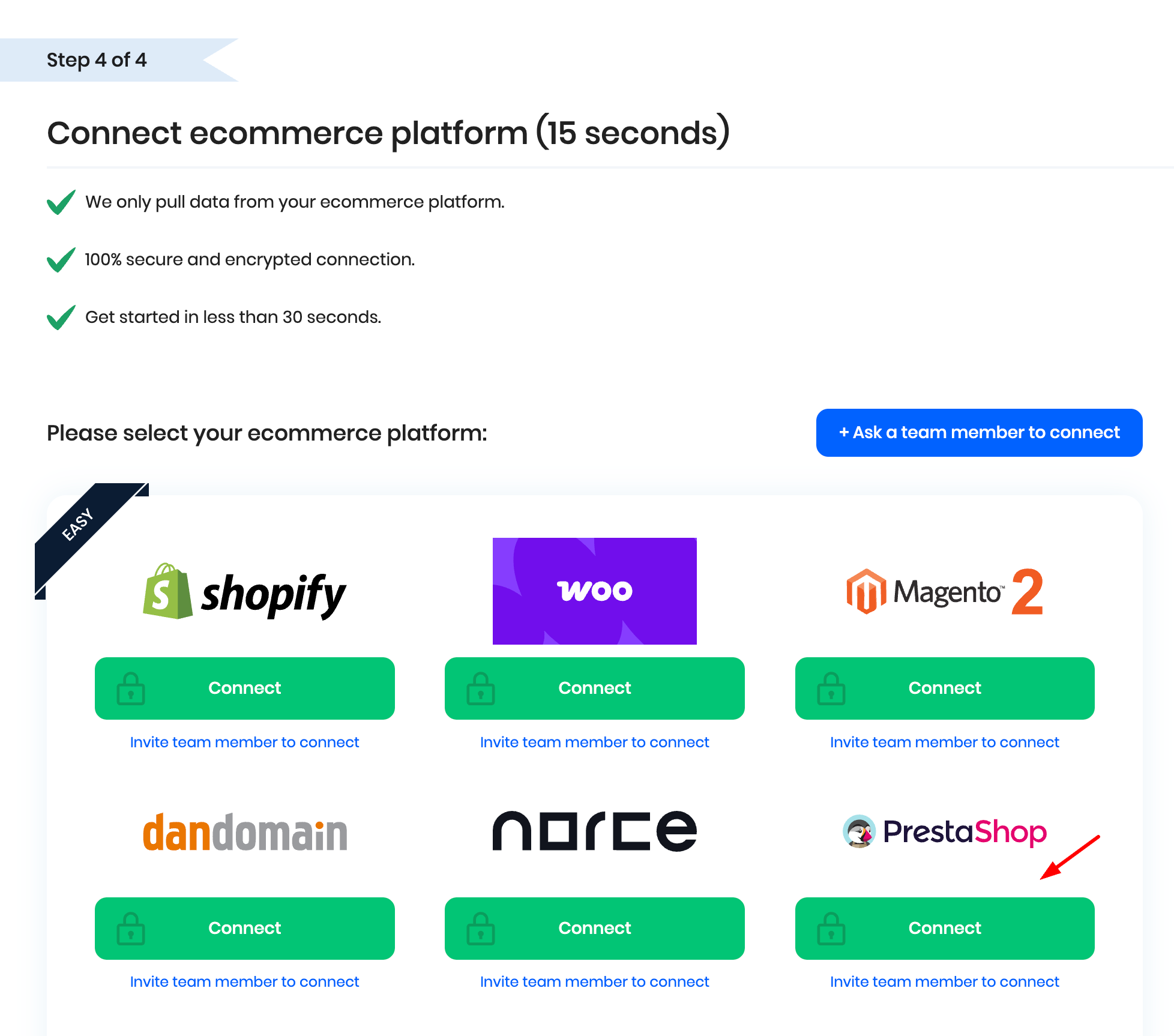 Step 4: In Reaktion, click Connect next to PrestaShop and paste your store's URL and the webservice key