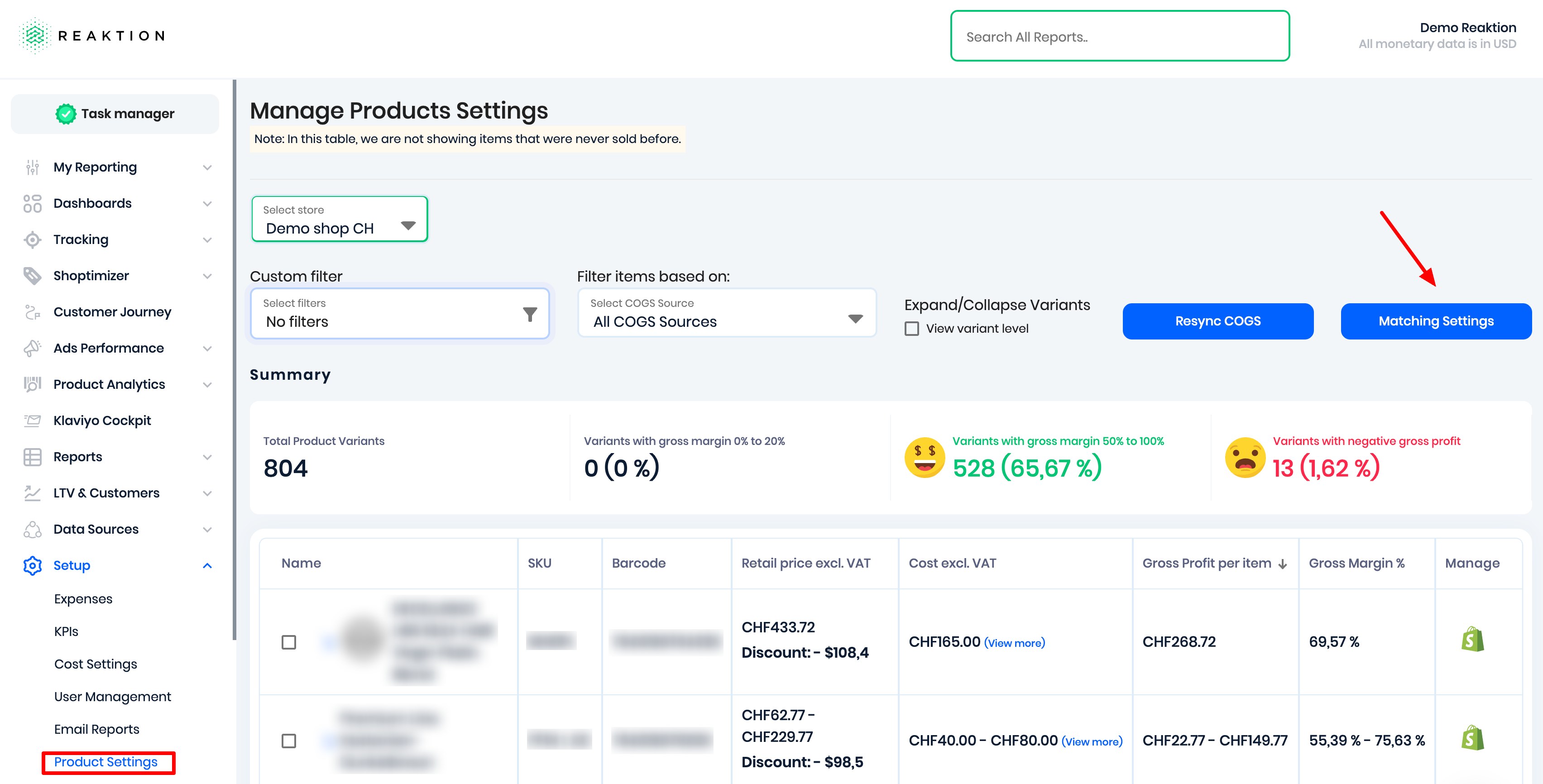 To select your Product matching method, please navigate to Setup > Product Settings > Matching Settings:
