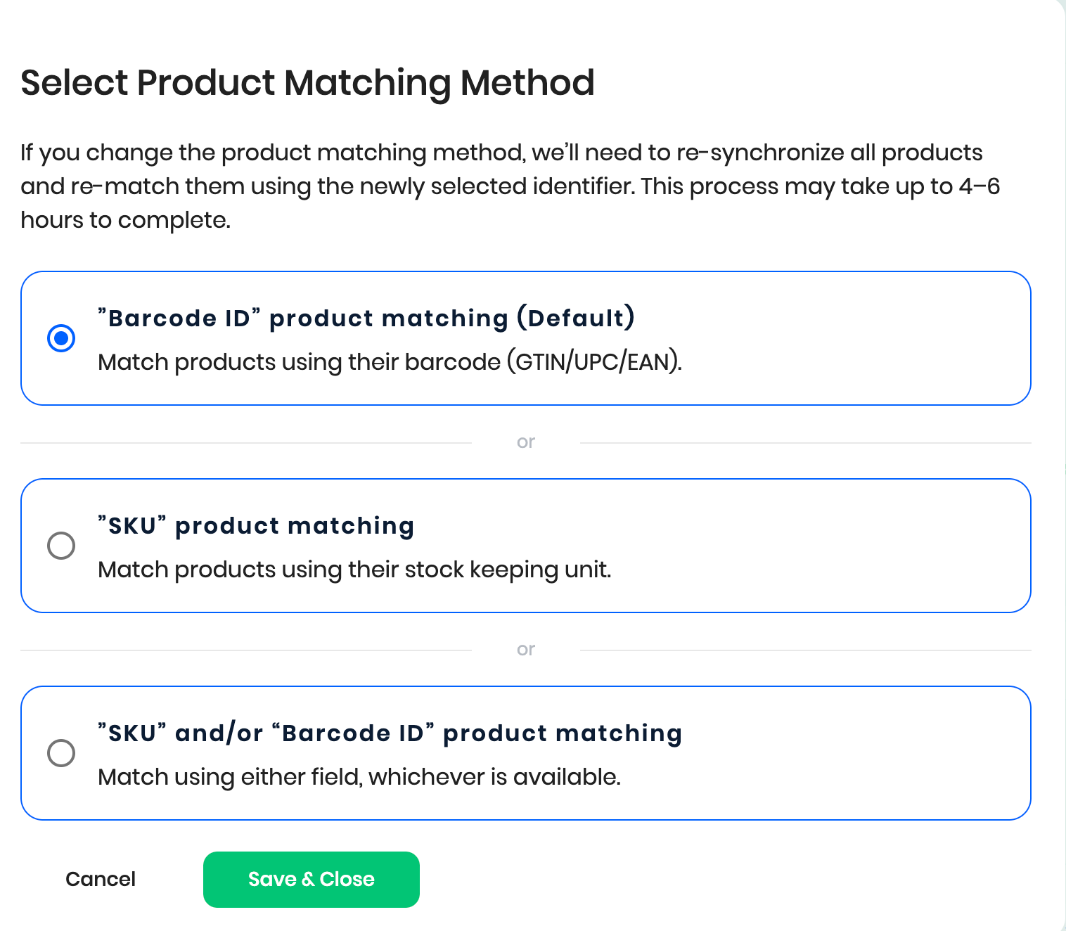 Our Product Identity matching matches items based on Barcodes. We also support Product matching based on SKU.