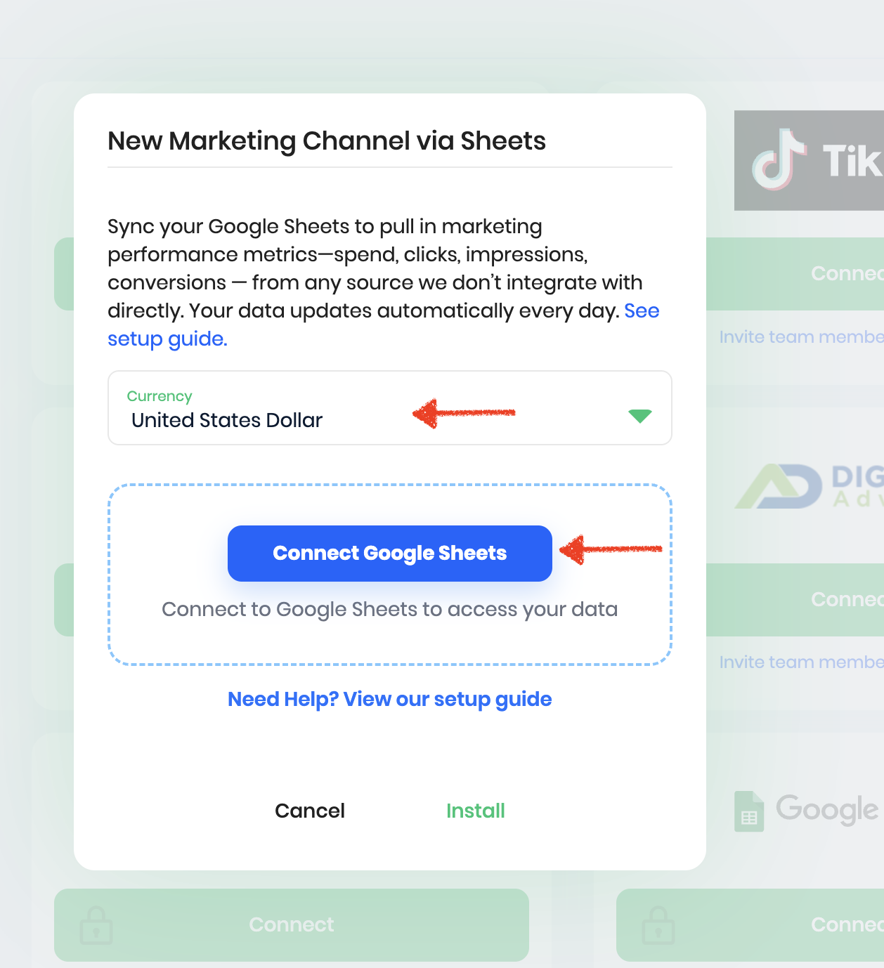 - Done! We will now synchronize your marketing data daily from your connected Sheet.