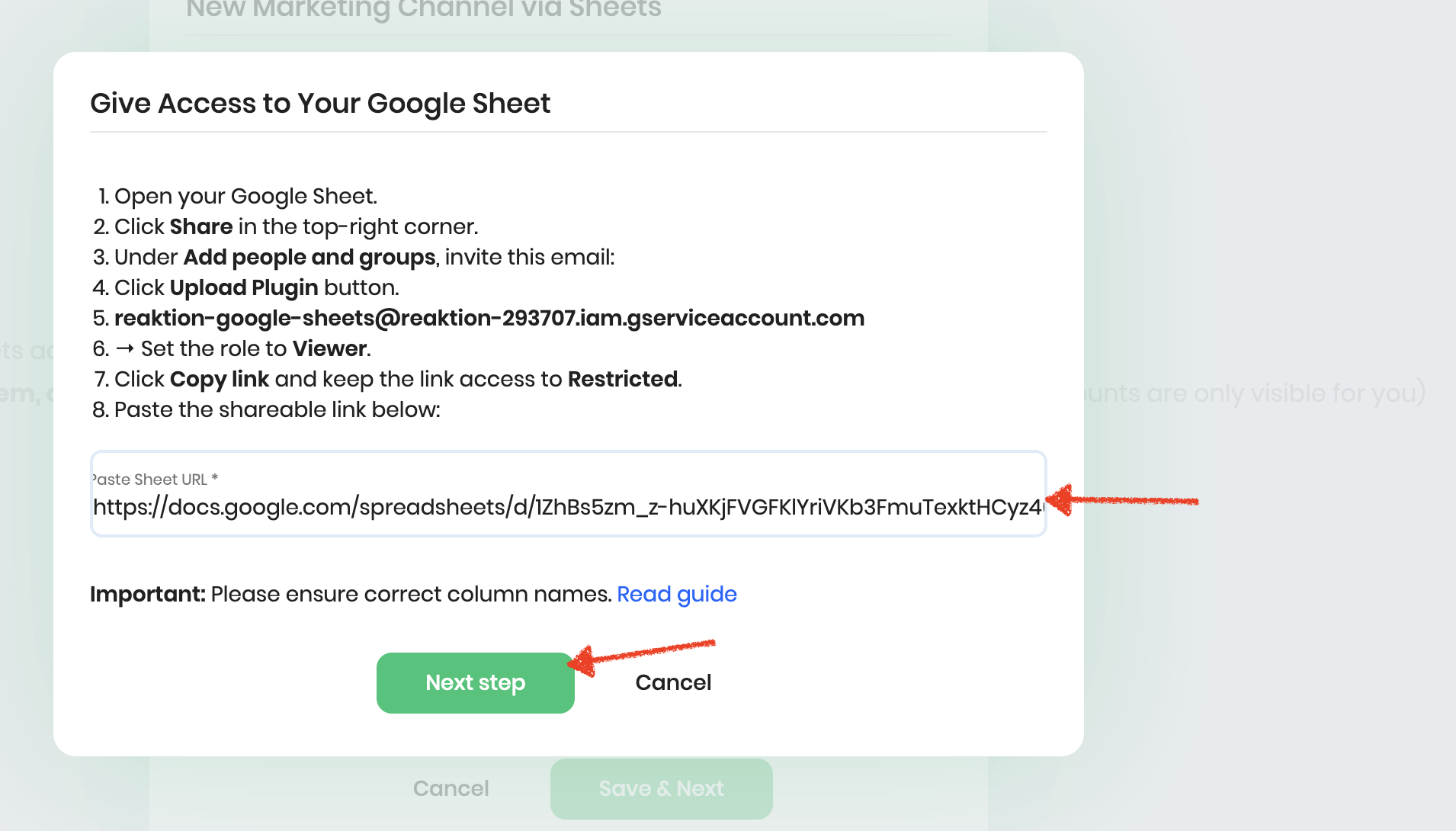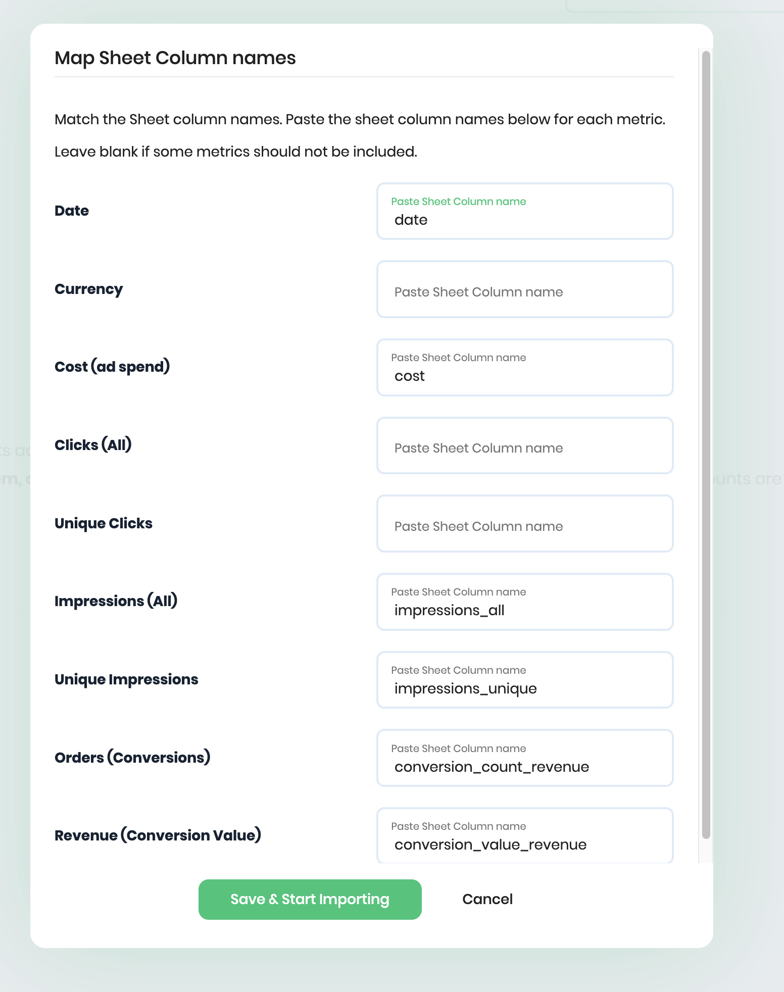 13. Now copy and paste the exact Sheet column names into each field you want to map in Reaktion: