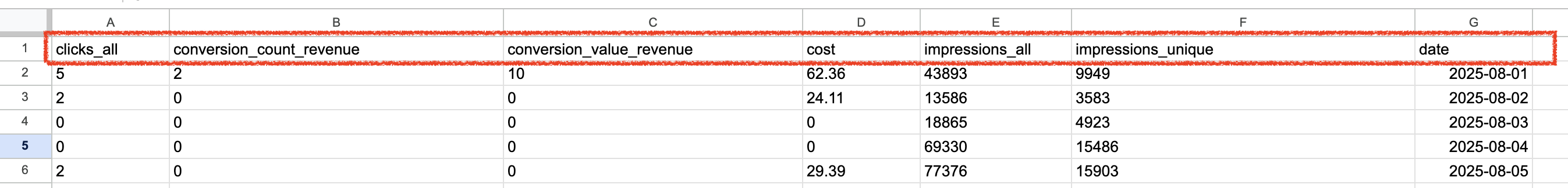 Create a Google Sheet, add data from any marketing platform, and sync it with Reaktion. Pull in standard performance metrics—spend, clicks, impressions, conversions—even from sources we don’t integrate with directly. Your data refreshes automatically every day.