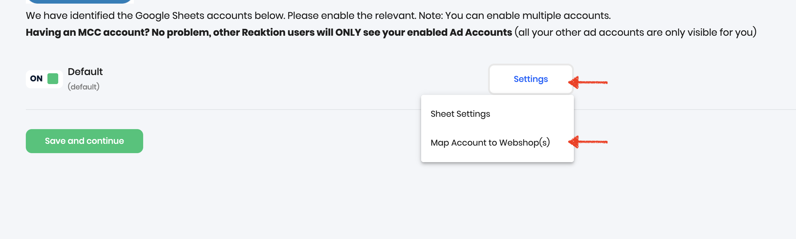 a. Click "Settings" and then on "Map Account to Webshop(s)"