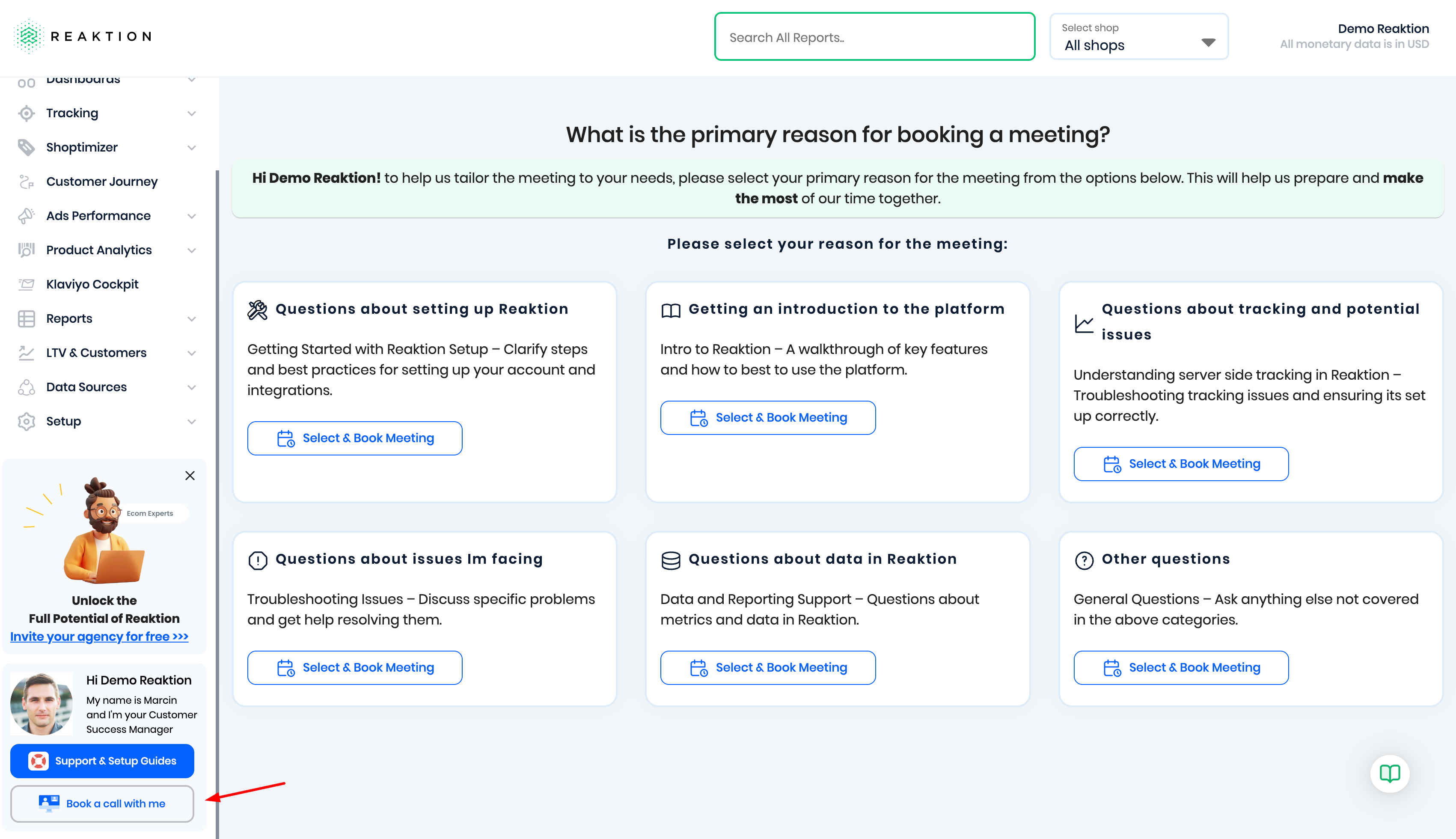 4) Call: To book a call with us, please use this Calendly Link. If you are an existing user, you can also book a call by clicking this link within your Reaktion account and selecting the relevant booking type: