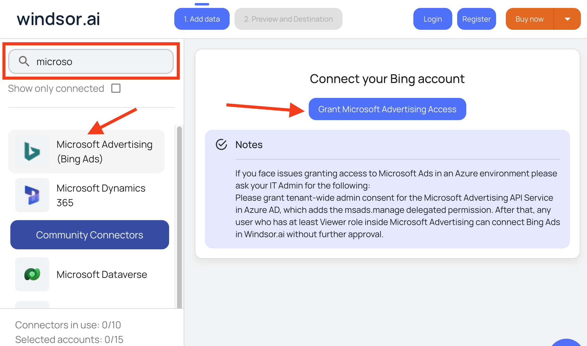 After you create your account on https://onboard.windsor.ai/, simply search for the platform you want to pull the data from and grant access: