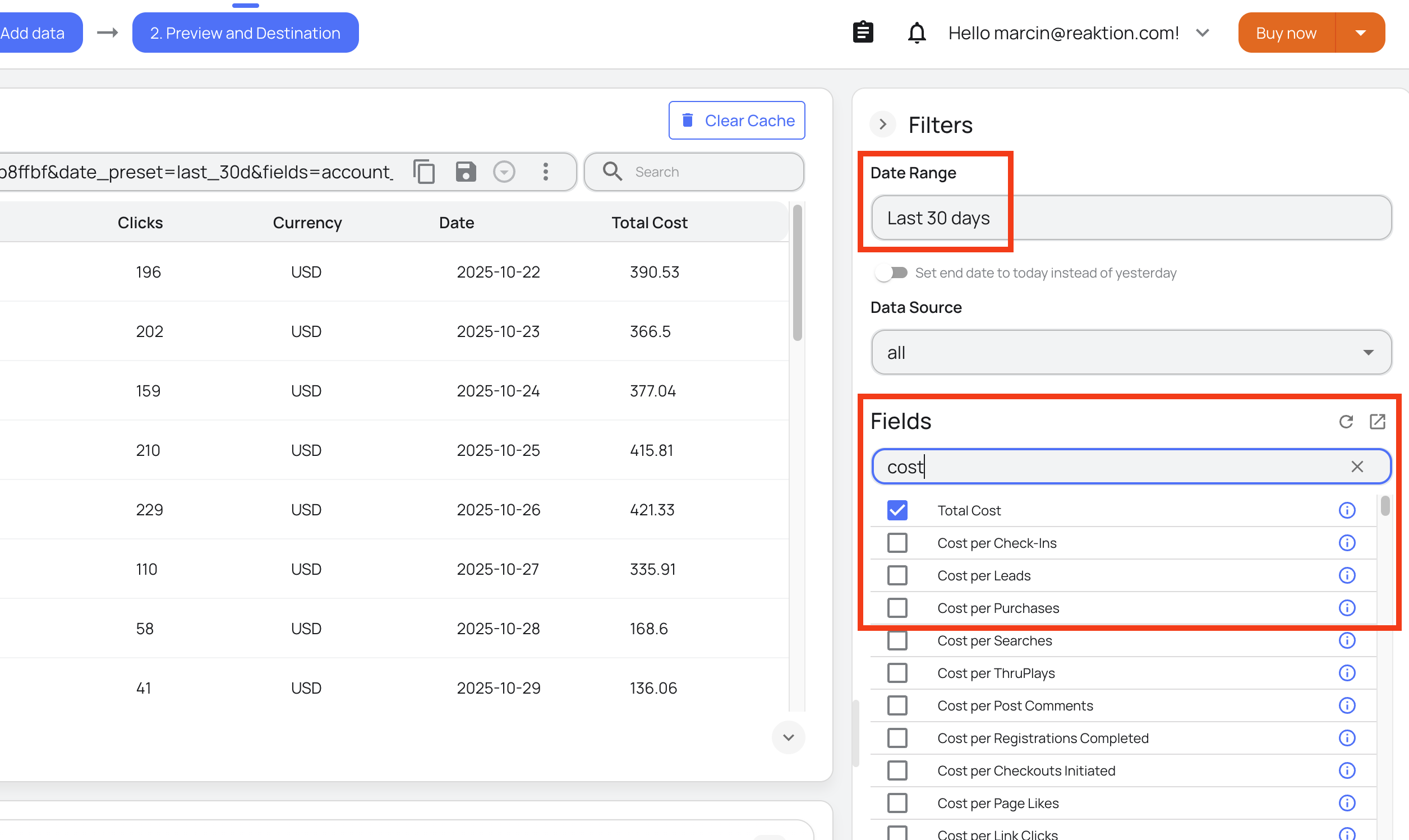 As the first step, it's necessary to set up an automatic data export from a selected marketing platform into a Google Sheets file hosted on Google Drive. To do so, you can use a free tool such as windsor.ai